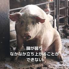 豚も高速成長の改良を重ねた結果、脚弱状態になり立てない豚が出ています。